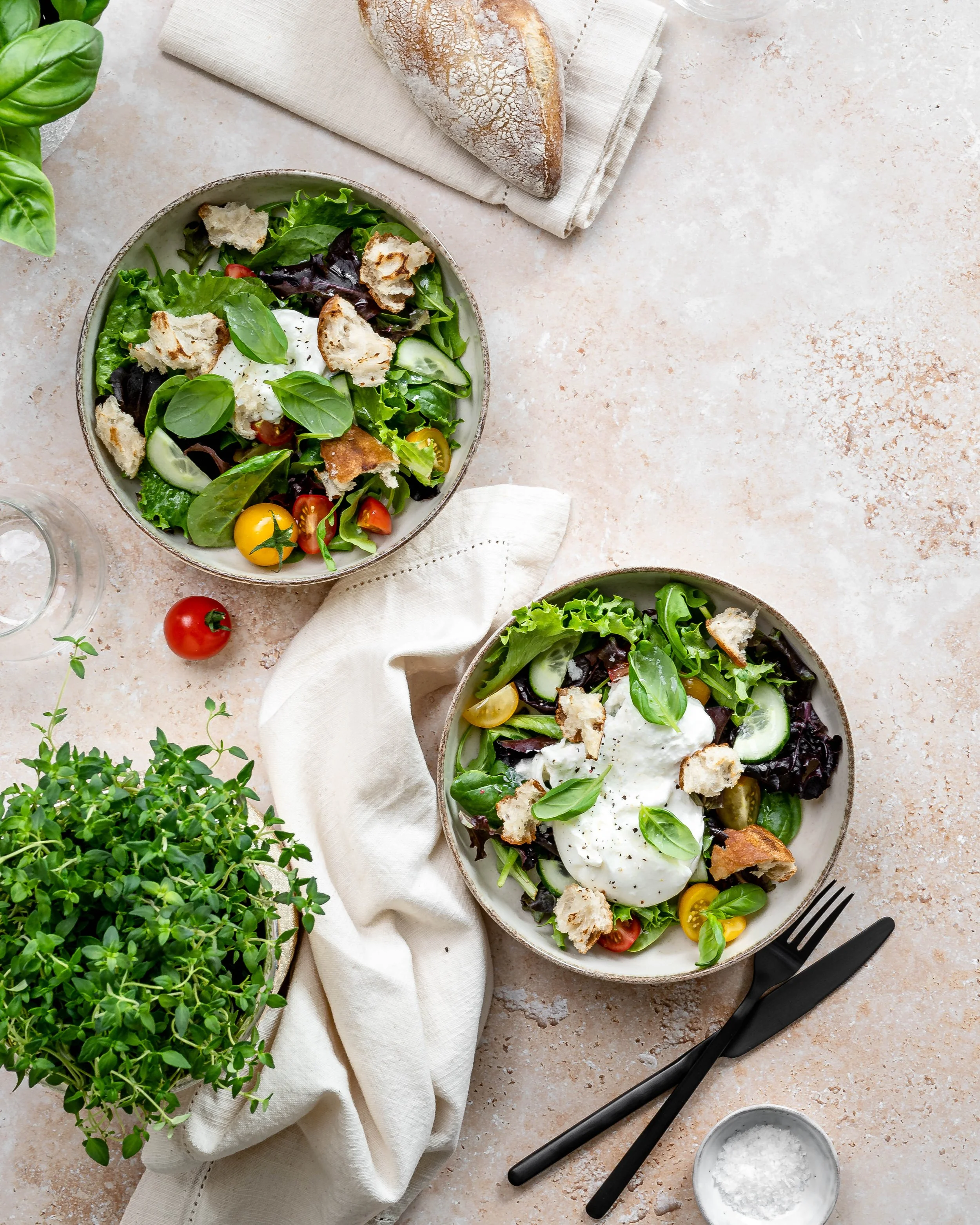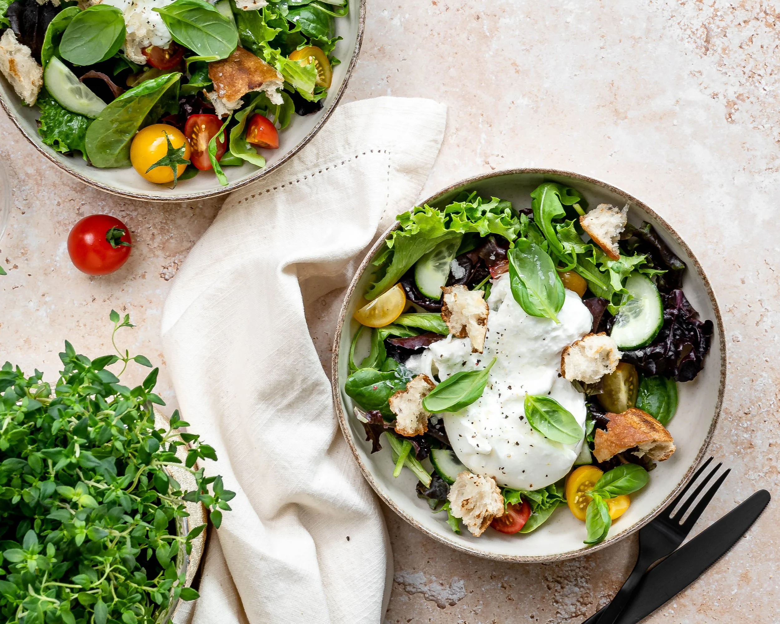 Salad bowl with mixed greens, cherry tomatoes, cucumbers, burrata cheese, and croutons, garnished with basil leaves, on a light textured surface with cutlery and a cloth napkin, accompanied by a small tomato and greenery plant nearby.