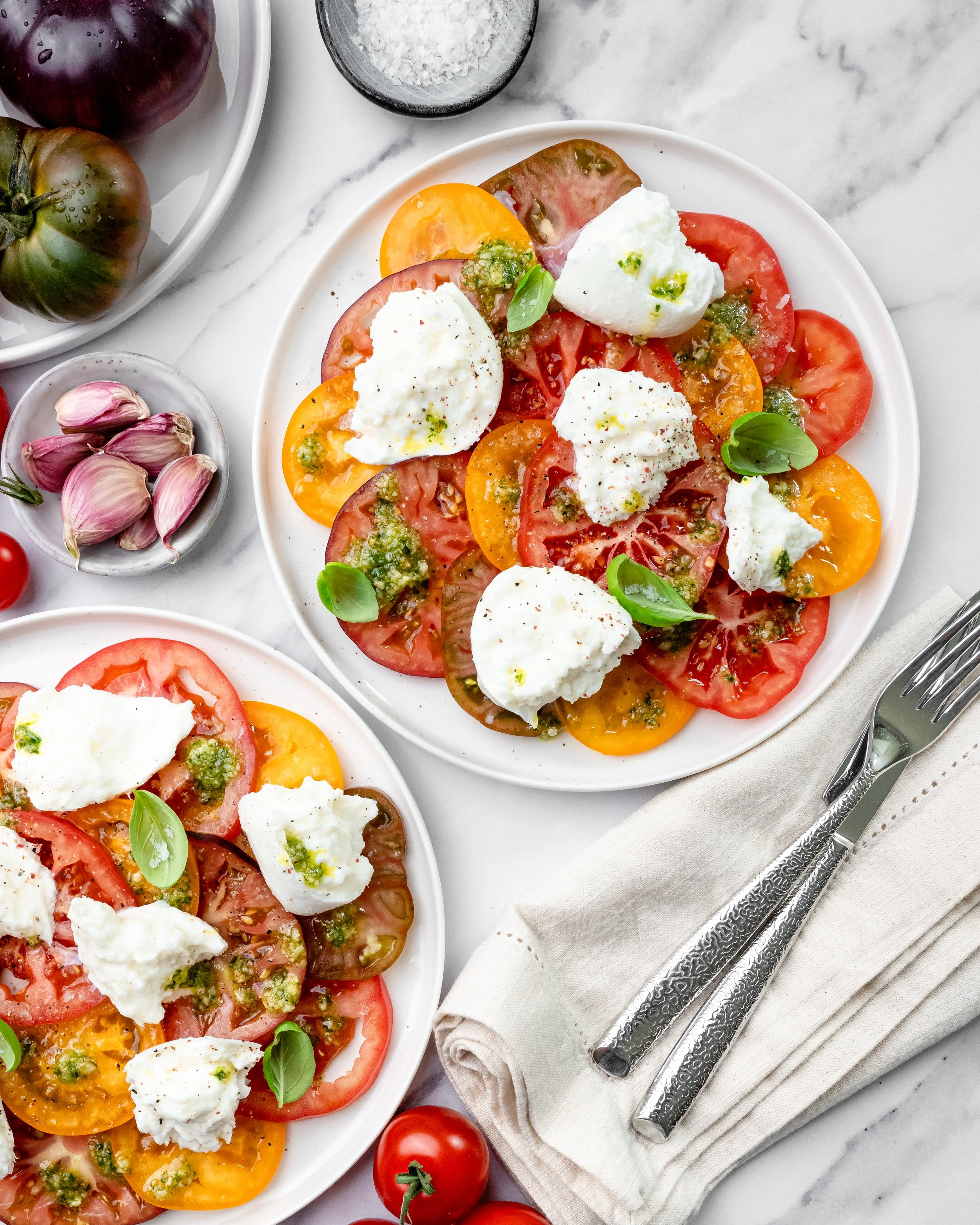 Plate of sliced heirloom tomatoes topped with burrata cheese, fresh basil, and pesto, on a white marble surface with garlic, cherry tomatoes, and salt nearby.