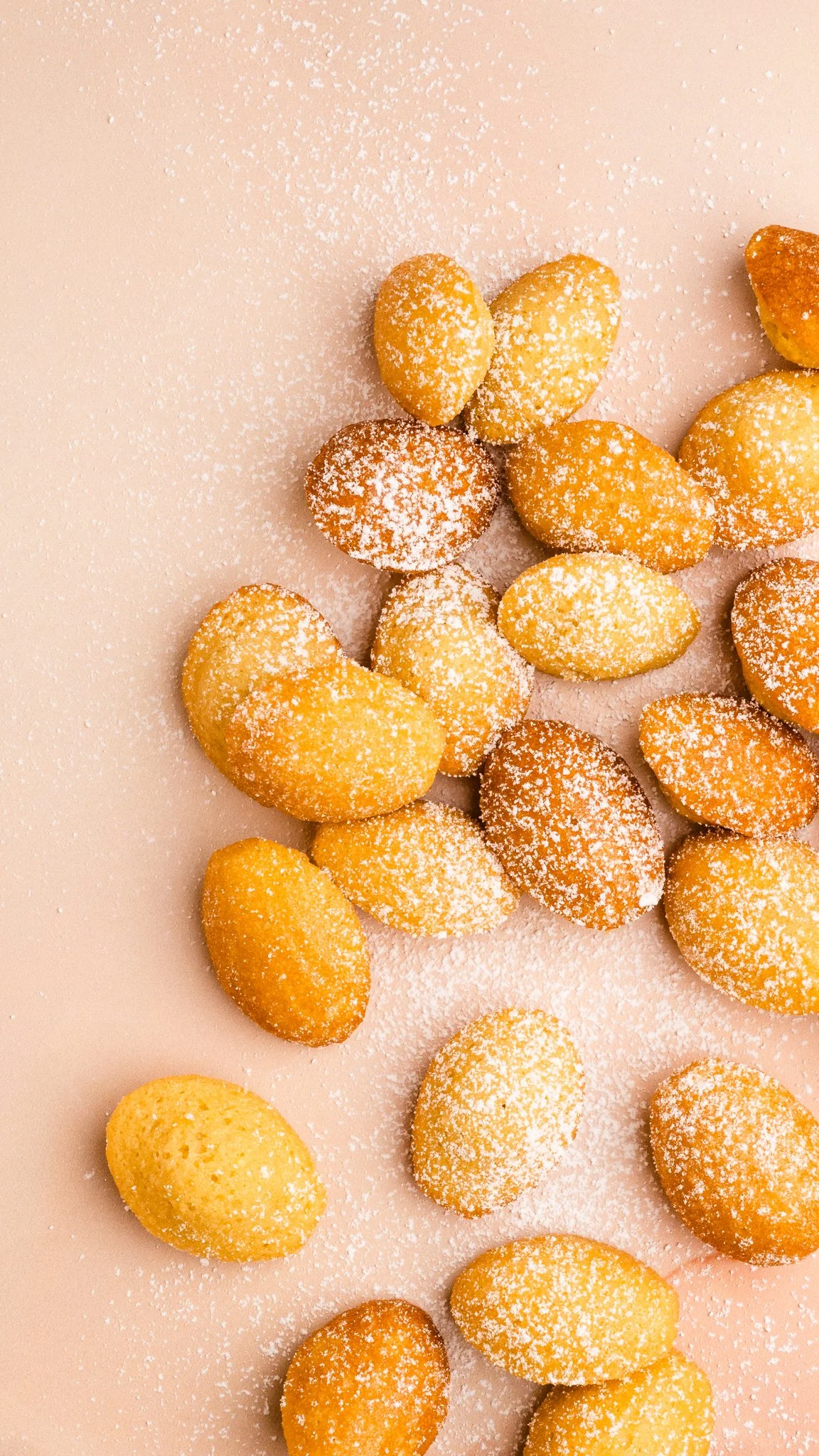 Golden madeleines dusted with powdered sugar on a light pink surface. View fullsize