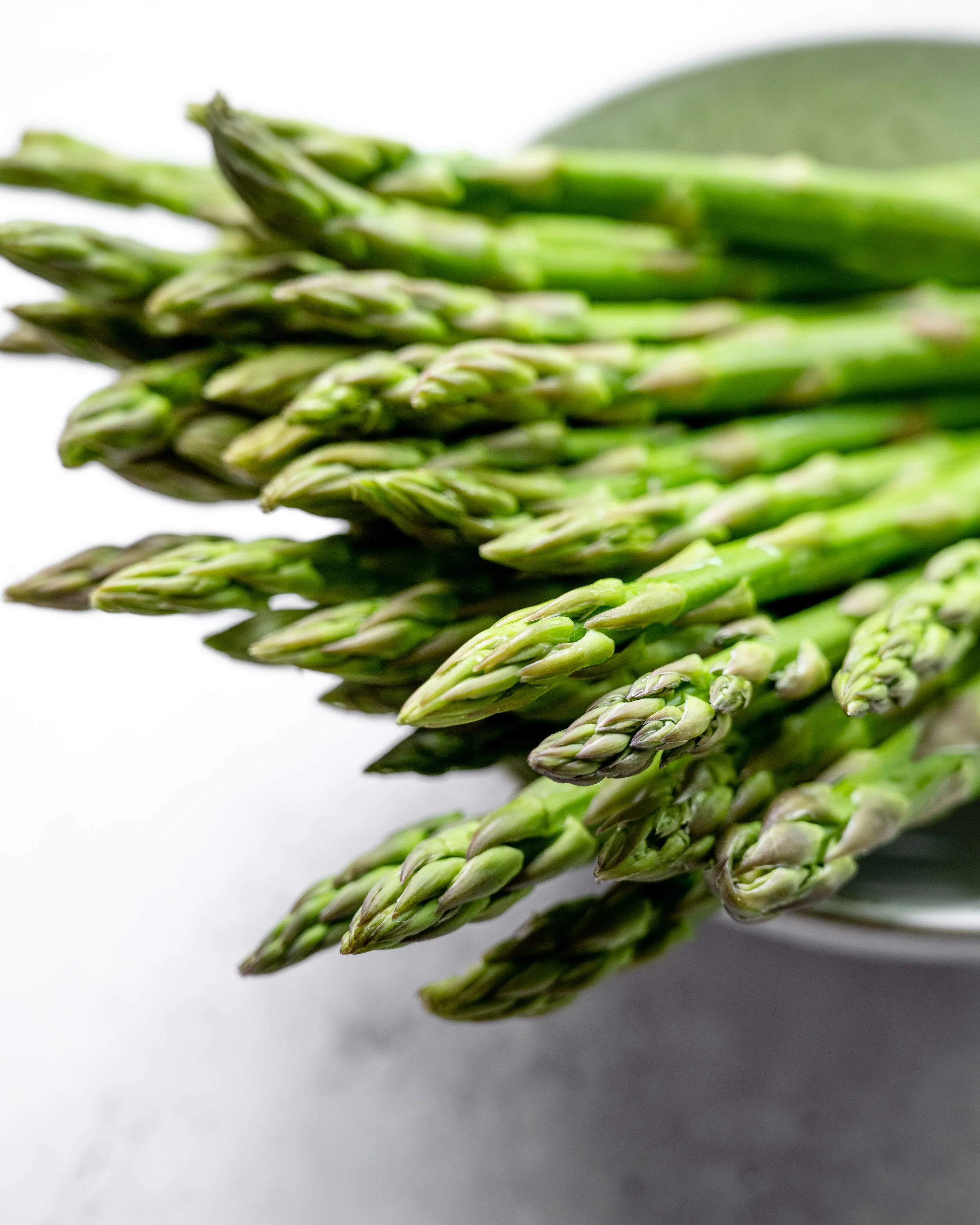 Close-up of fresh green asparagus spears on a light background.
