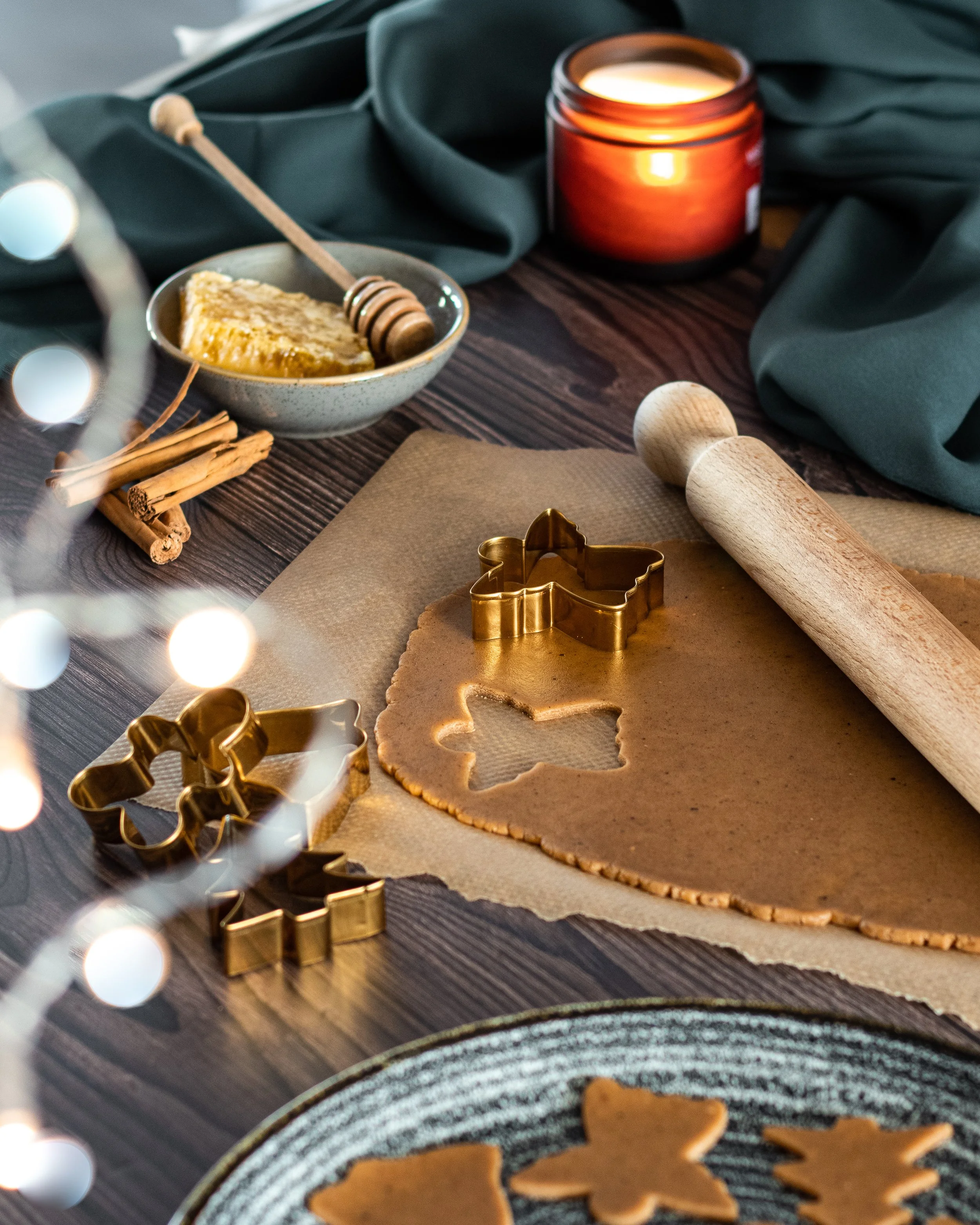 A wooden table with cookie cutters, rolled gingerbread dough, a rolling pin, a jar of candles, cinnamon sticks, a bowl of honey, and some baked gingerbread cookies in festive shapes.
