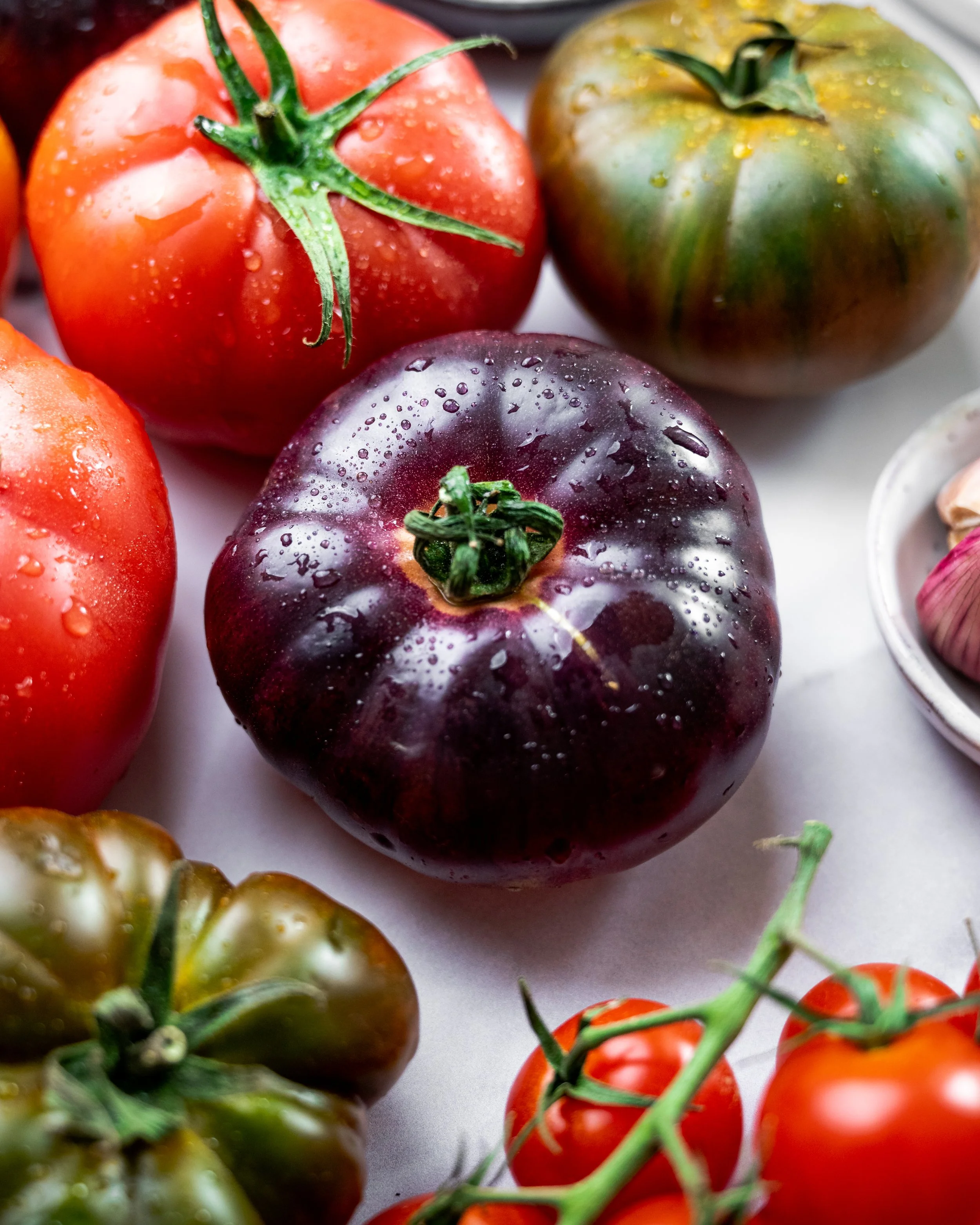 Various heirloom tomatoes with water droplets, including red, green, and dark purple varieties, on a light surface. View fullsize