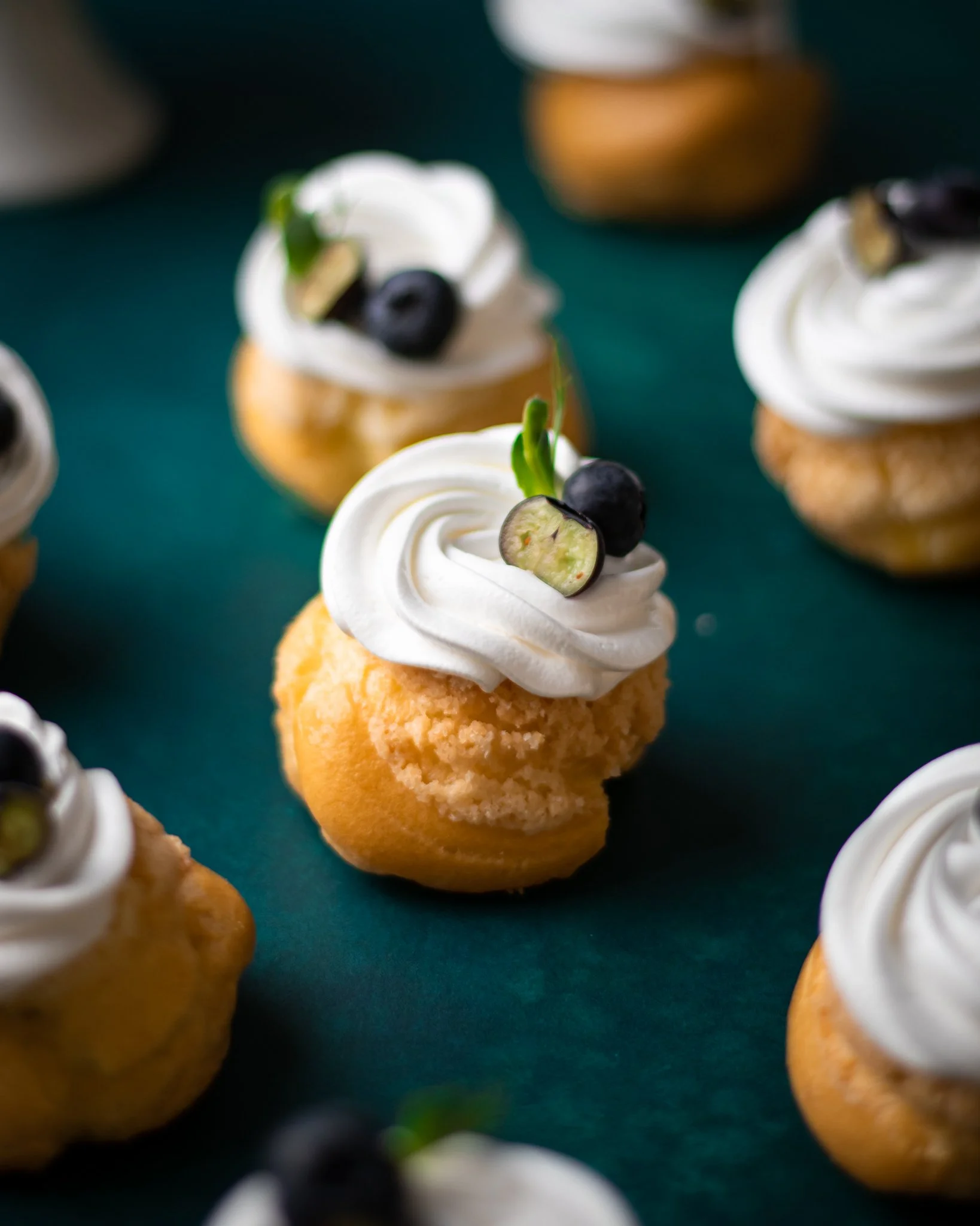 Mini dessert with a yellow cake base topped with white whipped cream and garnished with blueberries and a small slice of grape, decorated with green leaf-like sprigs.