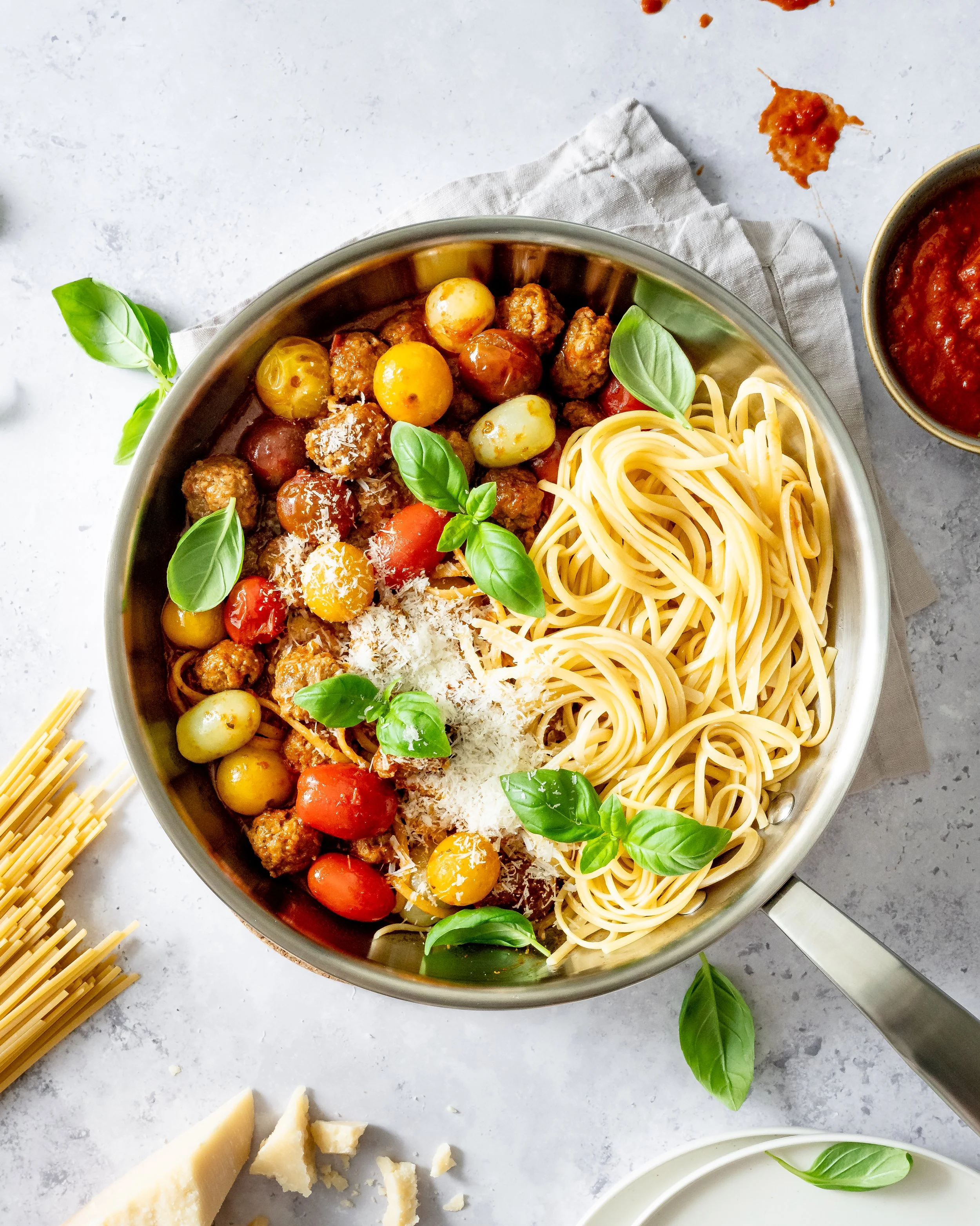 A pan of spaghetti pasta with meatballs, cherry tomatoes, and fresh basil leaves. The dish is topped with grated Parmesan cheese. There's also a bowl of tomato sauce nearby.