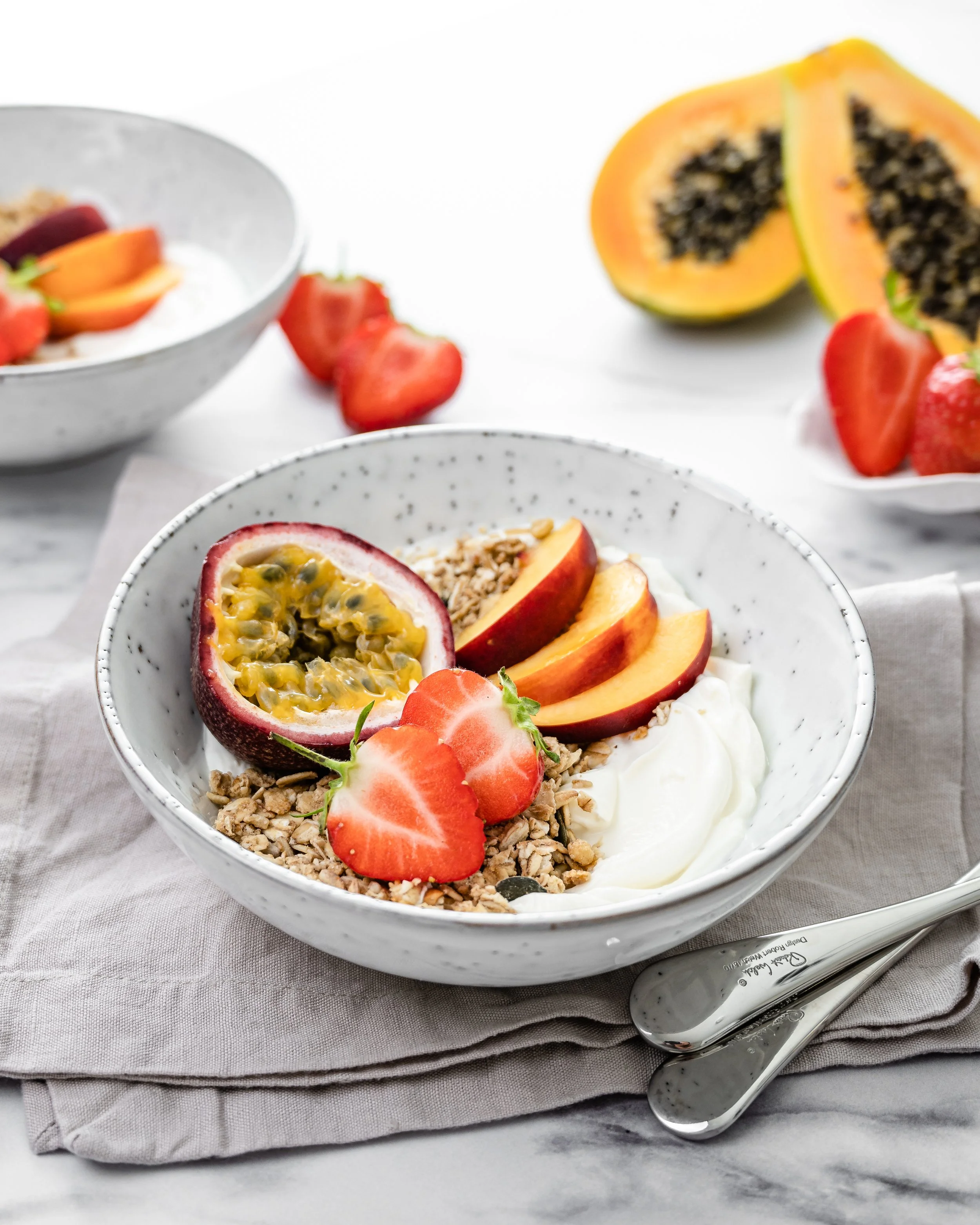 A bowl of yogurt topped with granola, passion fruit, strawberries, and peach slices on a marble surface with additional fruits in the background.