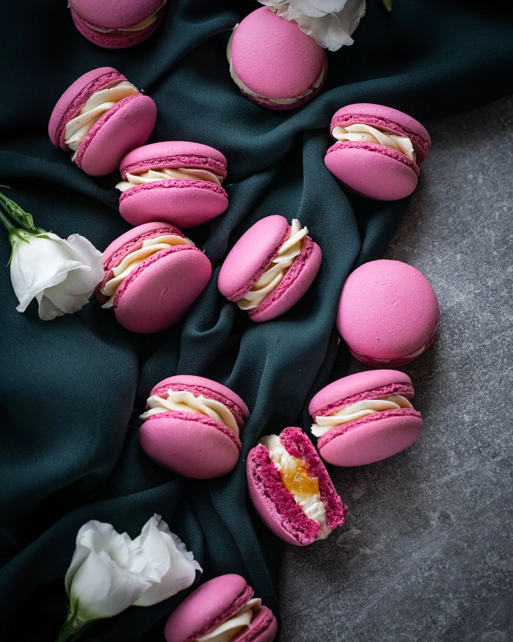 Pink macarons with cream filling on dark cloth, surrounded by white flowers.